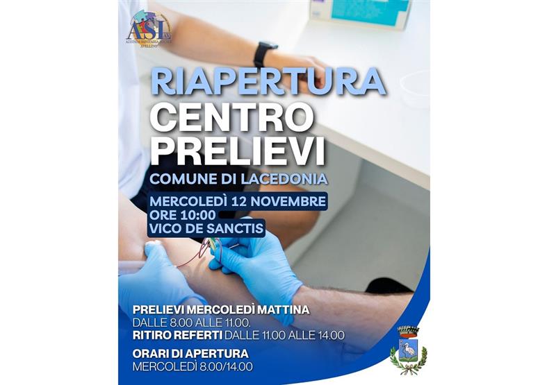 L’Amministrazione Comunale di Lacedonia è lieta di annunciare alla cittadinanza la riapertura del Centro Prelievi, che avverrà mercoledì 12 novembre alle ore 10:00, presso i locali di Vico De Sanctis, nell’[...]