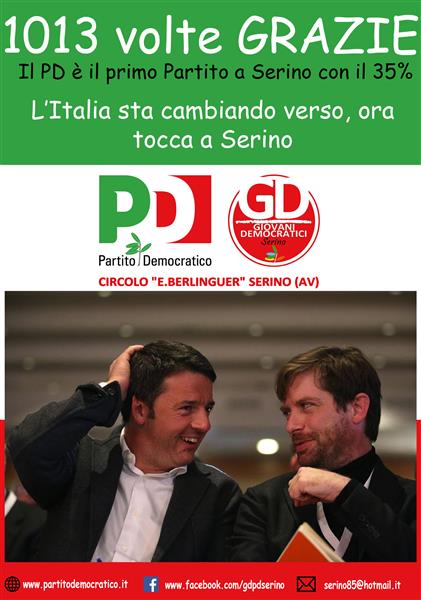 Gli iscritti al Circolo GD-PD “E. Berlinguer” di Serino esprimono tutta la loro soddisfazione per la straordinaria affermazione del Partito Democratico a livello nazionale e per l’altrettanto straordinario risultato di Se[...]