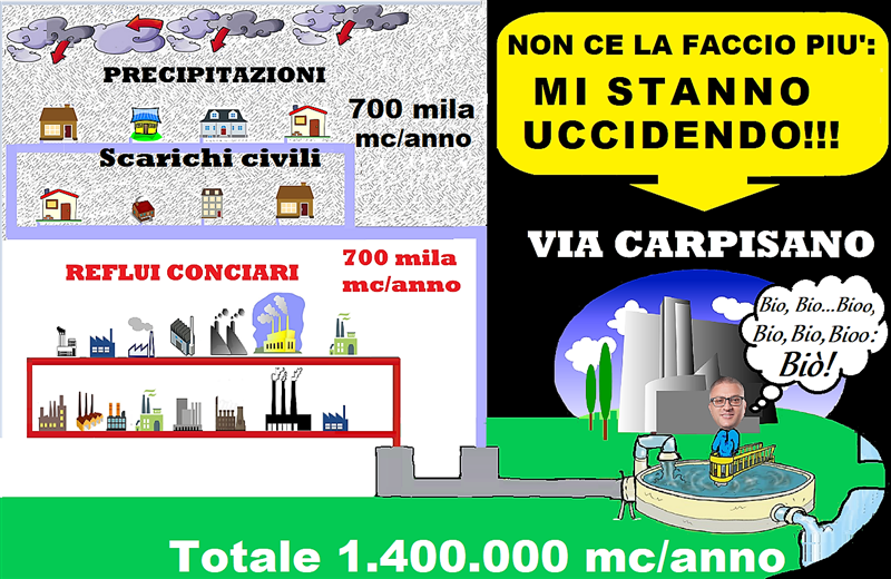 Così come è disciplinato l’attuale ciclo di depurazione, in via Carpisano, dovrebbero giungere solo 700.000 mc annui di reflui industriali; invece, per effetto della suddetta commistione delle reti fognarie (piovane, civili e industriali), l’impianto è “costretto” a depurarne 1.400.000 mc, con notevole aggravio di costi!